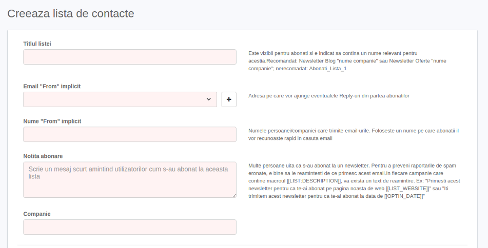 Apoi urmeaza sa completezi informatiile despre lista, precum numele acesteia, expeditorul email-urilor, numele companiei si alte date care vor fi folositoare in campaniile trimise.