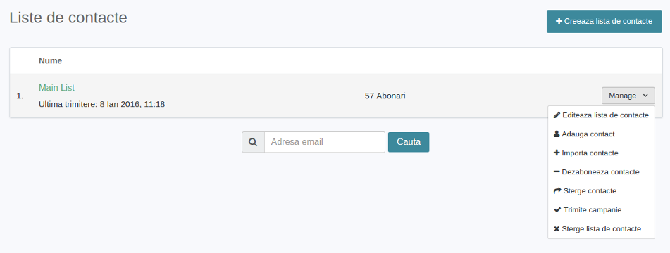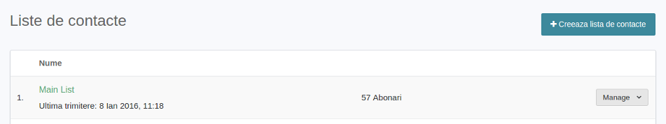 Dupa ce ai creat lista, o vei gasi la „Contacte”. Click pe butonul „Manage”, apoi selecteaza „+Importa contacte” pentru a adauga adrese de email in lista.