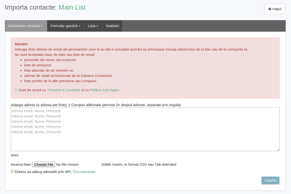Adresele de email se pot adauga manual, una sub alta, in formatul (exemplu@exemplu.com, nume) sau se poate folosi optiunea automata, prin incarcarea unui fisier CSV din care se vor prelua datele, precum si adaugarea adreselor prin API.