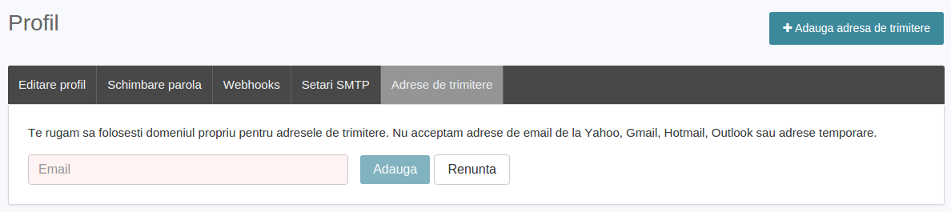 Trimiterea email-urilor tranzactionale incepe cu adaugarea unei adrese de trimitere. Aceasta o poti adauga prin accesarea meniului profilului, in coltul din dreapta sus, de unde selectezi ”Contul meu”. Apoi din bara de navigare a profilului selecteaza ”Adrese de trimitere”, apoi click pe ”+Adauga adresa de trimitere”.