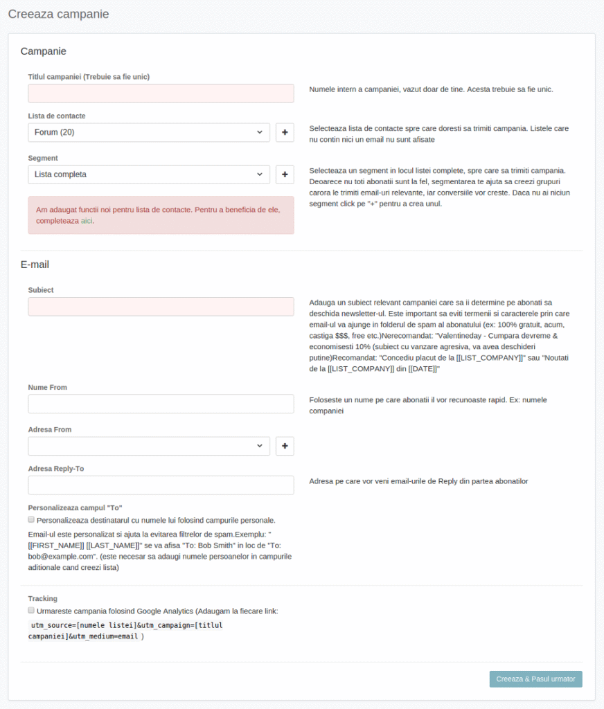 Adauga detaliile campaniei precum titlu, subiectul, nume from etc. si selecteaza lista de contacte spre care vrei sa trimiti (ai optiunea de a selecta toata lista sau un segment, in cazul in care ai realizat segmentarea).