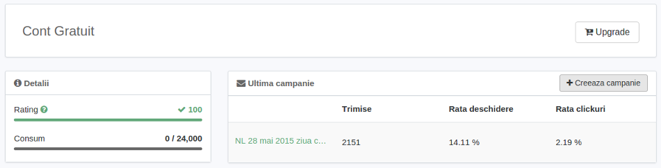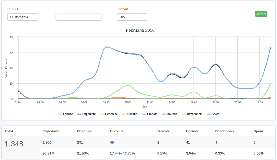 In statistici se poate urmari evolutia campaniilor si anume cate email-uri s-au trimis in total, numarul celor in asteptare, expediate, deschise si cate click-uri au fost date daca ai adaugat link-uri in email-urile trimise. Statisticile oferite sunt pe zile si in functie de acestea se pot imbunatati campaniile de promovare.